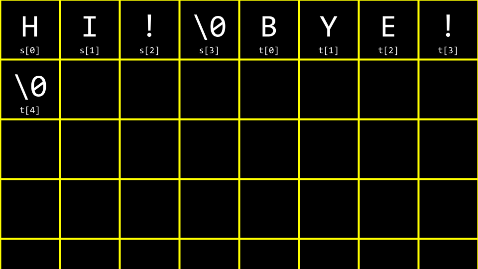 #include <cs50.h> #include <stdio.h> int main(void) { string words[2]; words[0] = "HI!"; words[1] = "BYE!"; printf("%s\n", words[0]); printf("%s\n", words[1]); }Observe que ambas as strings são armazenadas dentro de um único array do tipo